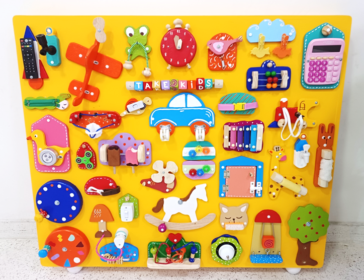 Nossos Mini Painéis Sensoriais são projetados para crianças de 1 a 3 anos. Este brinquedo sensorial promove a exploração tátil e o desenvolvimento da coordenação motora fina.