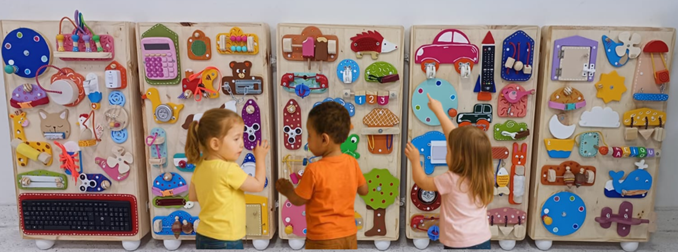 Para bebês e crianças em idade pré-escolar, painéis sensoriais de atividades servem como