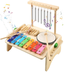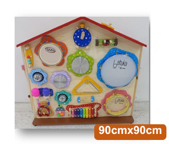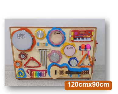 Nossas mesinhas e baterias musicais fabricados artesanalmente possuem diversos elementos de percussão tais como: xilofones, sinos, tambores, reco-recos e pratos. As crianças podem explorar diferentes sons batendo, agitando e raspando esses componentes, promovendo