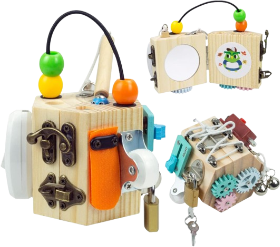 Cada mini painel e cubo sensorial são projetados de forma exclusiva com uma variedade de atividades interativas que incentivam o desenvolvimento da coordenação motora fina da criança por meio da exploração lúdica.