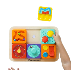Nossos Mini Painéis Sensoriais são projetados para crianças de 1 a 3 anos. Este brinquedo sensorial promove a exploração tátil e o desenvolvimento da coordenação motora fina.